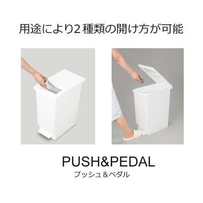 ●1)プッシュ&ペダル 2種類の開け方ができます 小さめなゴミをサッと捨てたいとき → ワンプッシュ 大きめなゴミ、まとまったゴミを捨てたいとき → ペダルでオープン大きな開口 2)洗練されたスタイリング 高級感のあるステンレスプッシュフタ ●サイズ:幅23.5×奥行41.5×高さ49.5cm 素材・材質:ポリプロピレン/押しブタ部=ステンレス 生産国:日本 ポリ袋適合サイズ:45L〜30L